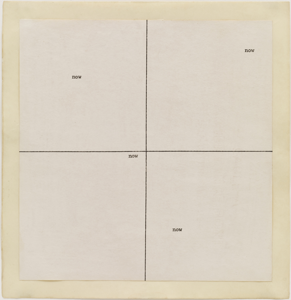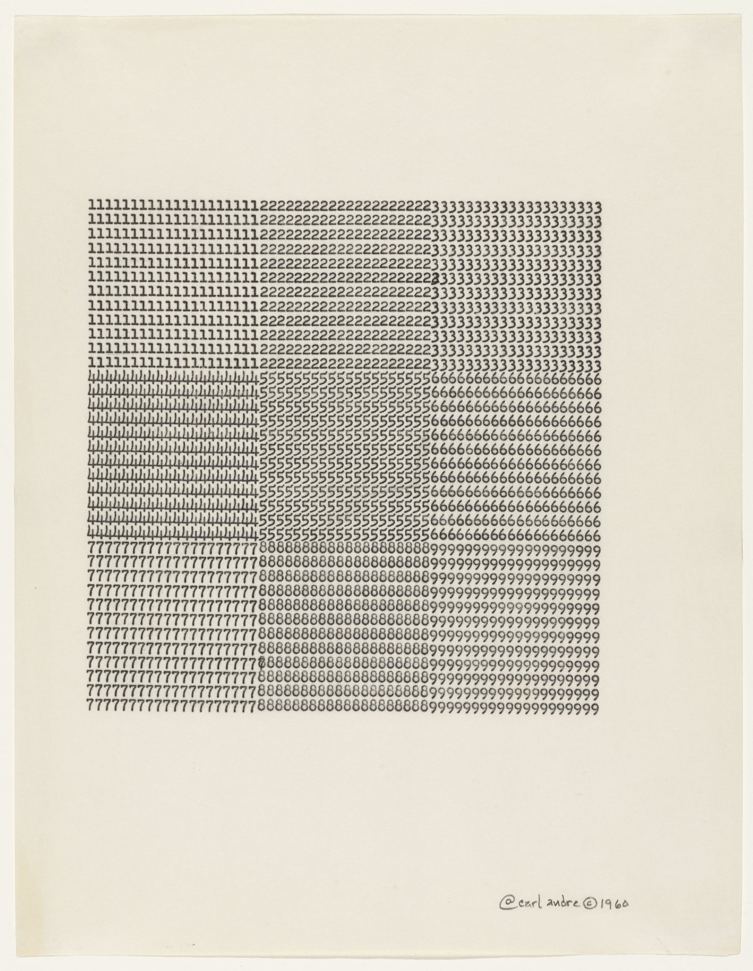 Untitled bears a striking resemblance to a series of floor pieces that Andre began in 1962, just two years after making this work on paper. Whereas traditional sculpture establishes a hierarchy of viewing by requiring viewers to gaze up at it, Andre’s sculptures consist of flat metal squares in varying finishes installed on the floor, so that viewers can walk over them. To further foreclose on the autographic, Andre chose not to make these sculptures by hand, but rather to have them executed by machine, much like their typed antecedent. Part of the process of viewing Andre’s floor works includes walking over them—and the viewing experience becomes one of bodily movement through space and time, replacing the traditionally optical, deeply hierarchical relationship between a viewer and a sculpture. This attempt to banish the hierarchy between the (often literally) elevated sculpture and the viewer was very much in step with the culturally and politically democratizing efforts that have come to define the 1960s.