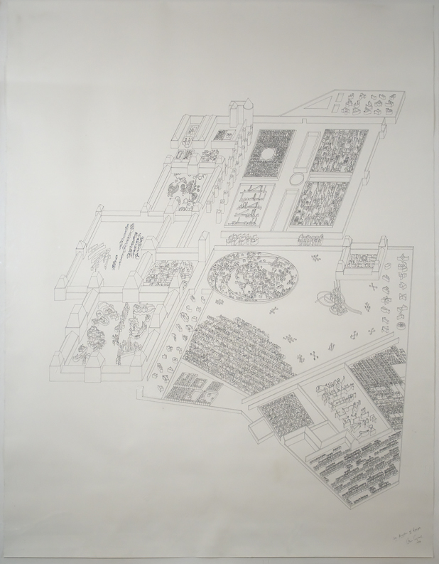 At first glance, Alice Aycock’s The Garden of Scripts (Villandry) from 1986 resembles a drawing by a landscape architect for a potential client. Upon closer examination, one realizes that this garden is filled with characters from various languages. The three-dimensionality of the scripts exposes this drawing as the work of a sculptor. In fact, Aycock drew The Garden of Scripts as a topiary-filled labyrinth, intending fictitious visitors to “walk in and throughall [of] these languages,” which is aligned with the artist’s wish to eventually translate this garden into sculptural form.1