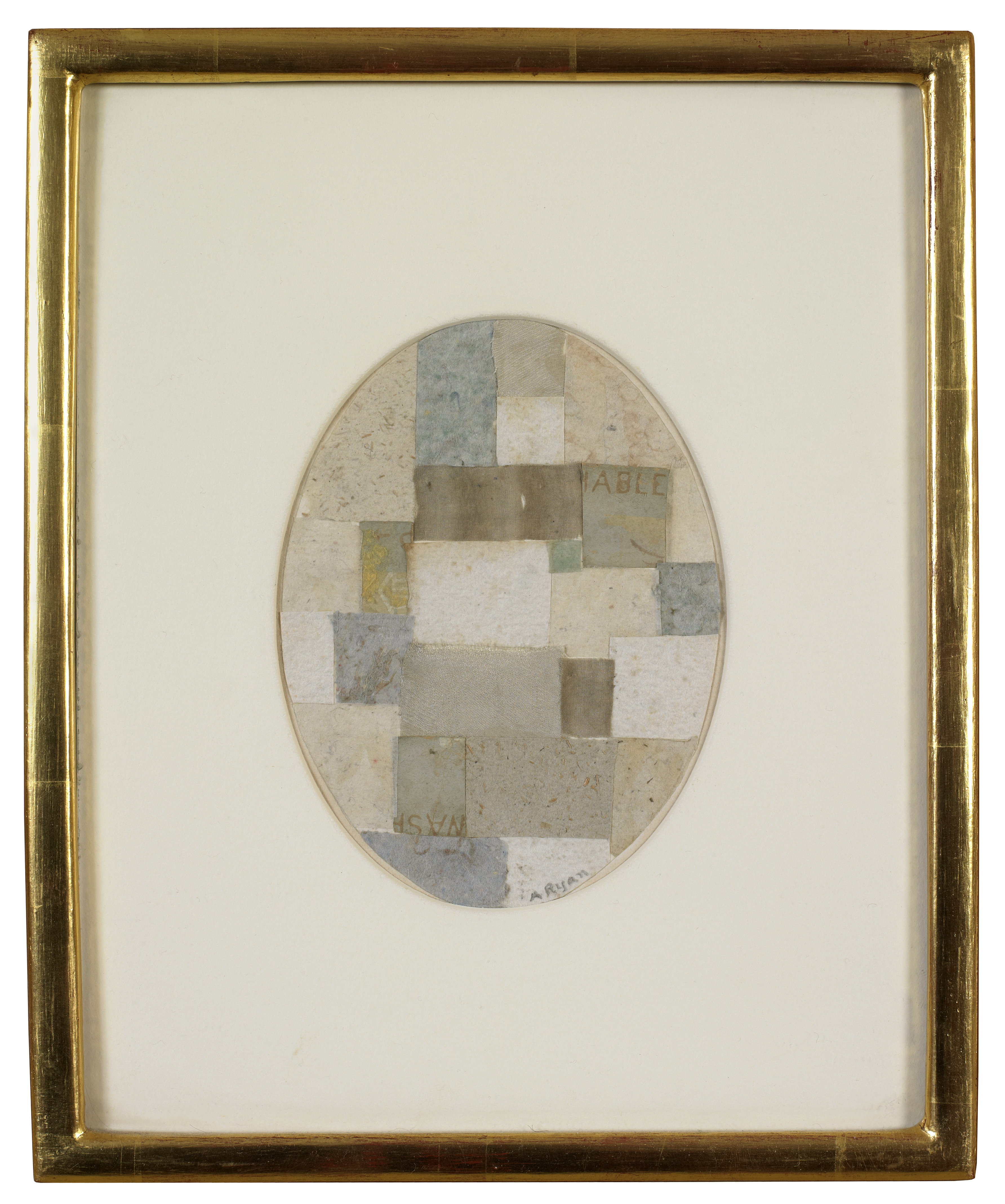 It is said to have been an exhibition of the work of Kurt Schwitters that inspired Ryan’s shift in medium. Her early implementation of connotative found materials, such as postage stamps and photos, led to her use of rice papers and cloth. Paper and fabric are both employed in Ryan’s collage Untitled (Whites with Greens) (1952). This work falls in line with Ryan’s signature formal geometry and diminutive scale. The scraps of paper and cloth are interspersed in a way that resembles a quilt, with the words wash and able the only legible text in the work.