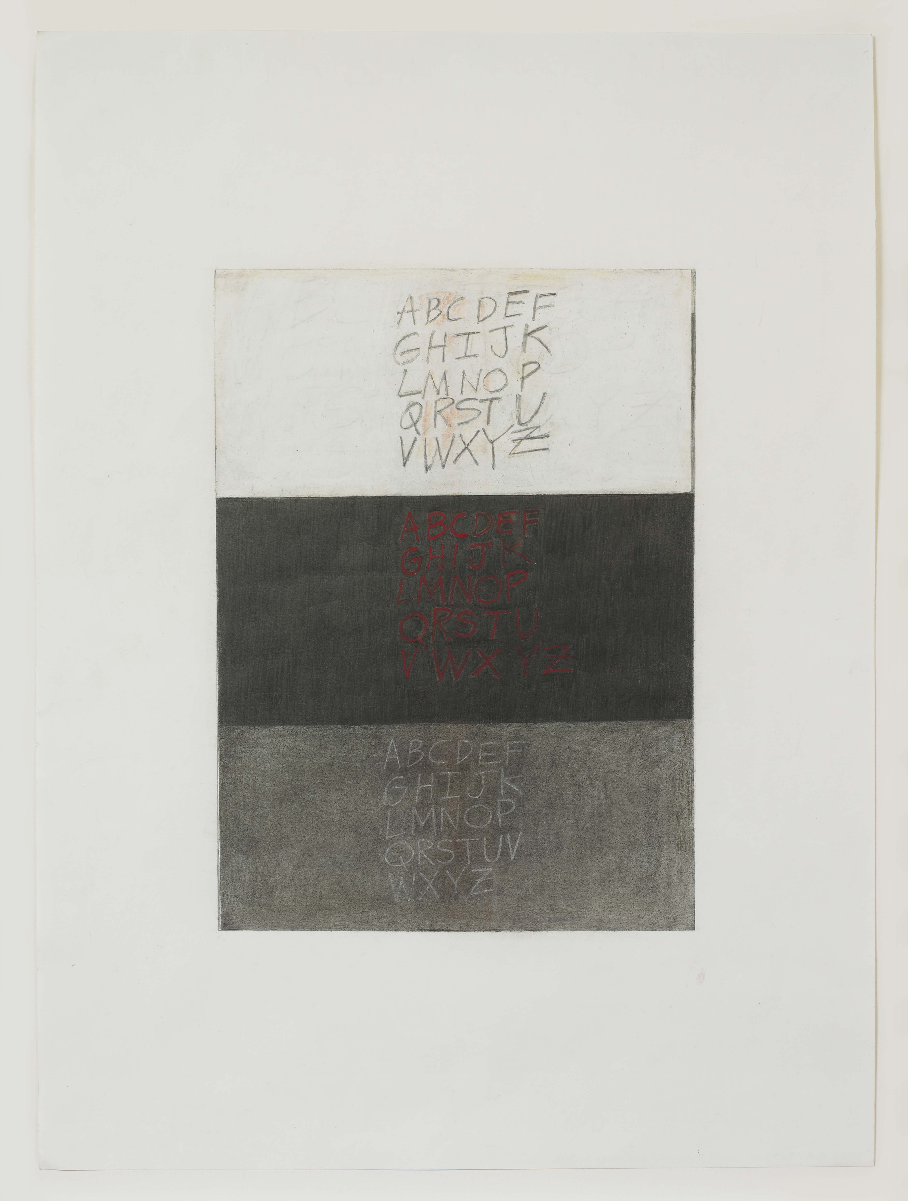 In Three Alphabets (2013), Gloria Ortiz-Hernández juxtaposes three versions of the English alphabet. The first is written in pencil on a ground of white oil pastel, the second in red pastel on charcoal, and the third in white pencil on charcoal. The upper register, which in its use of graphite on white recalls the work of Cy Twombly, suggests lightness in contradistinction to the middle register, which with its red and black palette stands in simple opposition to its neighbor. Ortiz-Hernández abuts two permutations of the same thing, revealing both similarity and the possibility of difference. The pale text on grey background found in the lower register serves to mediate the first and second alphabets, collapsing the two into one another.