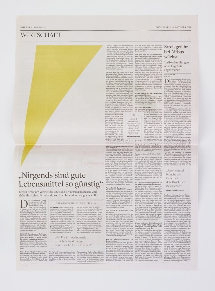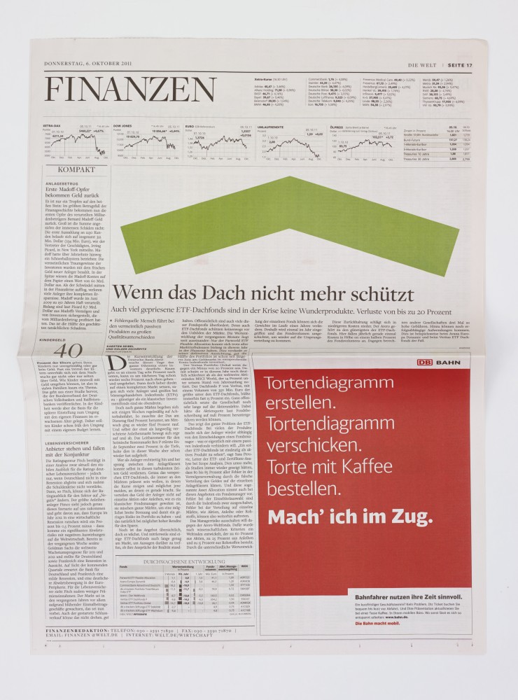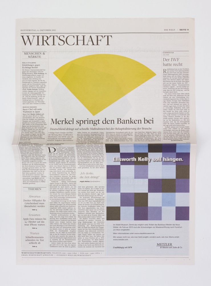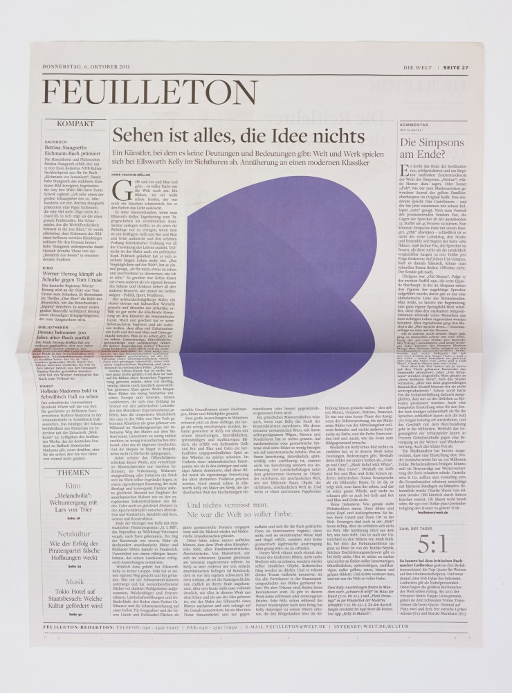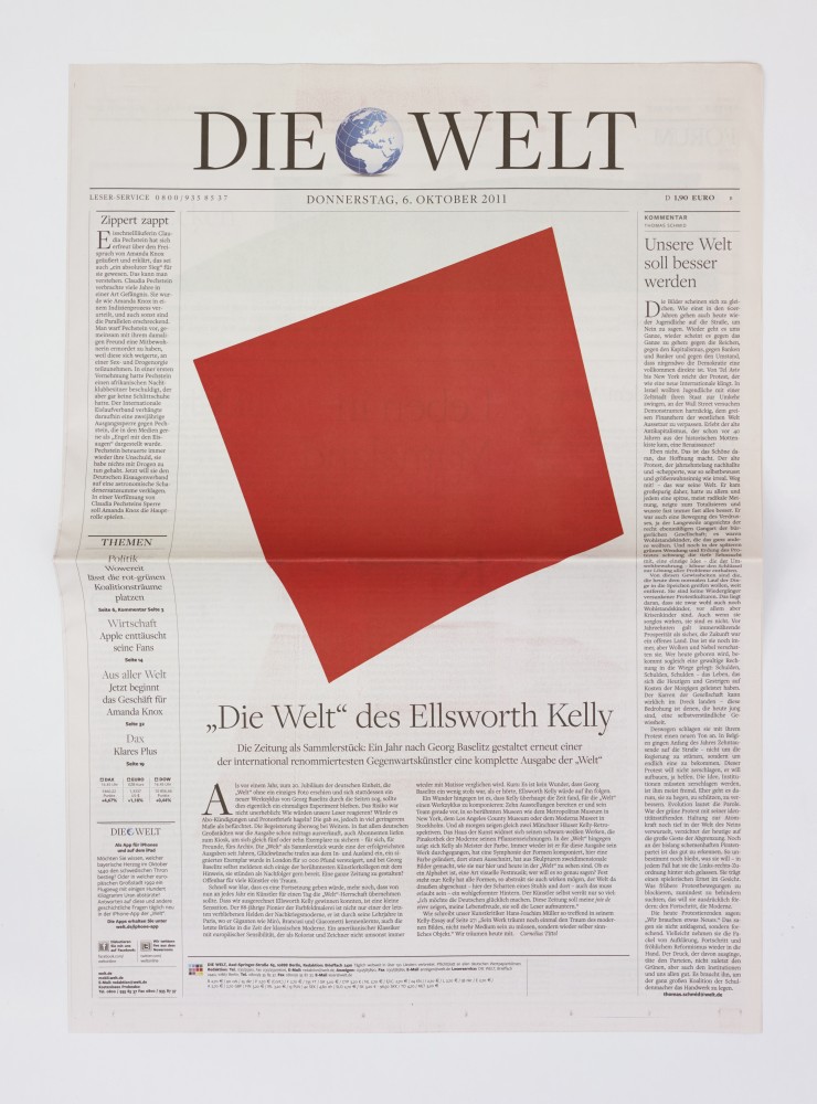 As part of a series organized by Die Welt, the leading conservative German newspaper, Kelly designed an edition of the paper to feature his signature abstract shapes where readily digestible photojournalistic images would usually be found. Images found in newspapers are customarily in conversation with text, often glimpsed as supplements rather than examined on their own. Photojournalism, however, is uniquely situated as the practice of capturing a precise moment and telling a story without words—an important component of reportage that, in daily periodicals such as Die Welt, might otherwise go unnoticed. Kelly’s intervention challenges the relationship between image and text in a specific context, while also raising questions about the ability of abstract art to speak directly to experience.