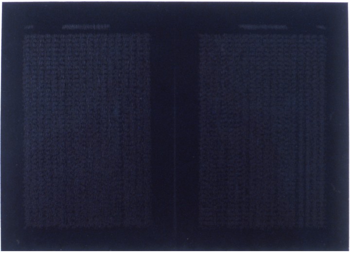 In her Films on Paper series, McClure utilizes colored transfer paper as a surface upon which to relentlessly accumulate the subtitles of a film, faithfully tracing each letter in its original typeface and screen placement onto a single intimately scaled page or series of pages. Often copies of Japanese subtitles for English-language films, the characters stack upon themselves, solidifying into shimmering bands of near-formless markings at the paper’s edge. These have been described as “light bands,” and rightfully so—they glow from the page, exuding a permanence not typically associated with the fleeting language of film, a time-based medium. An Inn in Tokyo: Intertitles to a silent film by Yasujiro Ozu (2003) is transferred from a 1935 film known for its subtle acting and powerful visuals invoking the struggle with depression and poverty in a small, honorable family. The condensed nature of the image here indirectly alludes to the relative simplicity of the silent film era, when language was an interruption and not the focus of the largely visual narrative. Intertitles, rather than simply filling in characters’ words, pause the visual action to provide a subjective narrative description; similarly, McClure offers a removed, condensed image as a source from which to intuit the film, aesthetically.
