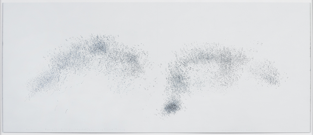 In works that capture the running subtitles of a film—such as Blue Velvet: Japanese subtitles to a film by David Lynch (2001)—the bands of form appear denser, as subtitles simultaneously capture the spoken arc of action and narration. In a way, subtitles provide a more objective translation of the world of the film, though mistakes can occur as a character’s particular words become lost in translation. In The Postman Always Rings Twice, a series of drawings based on the Japanese translation of a novel by James M. Cain (2005), five sheets of paper are entirely consumed by McClure’s faithful, painstaking tracing of the entire novel. While a Western viewer might sense an adaptation into Japanese from the faint vertical thrust of the markings, the dual monoliths of each page spread also share an uncanny formal affinity with the original English volume, capturing even the pagination and titling in the block header. The intrigue of the novel is muted, scrubbed away by McClure’s hand, its meaning buried within a literal run-down of form across the page.