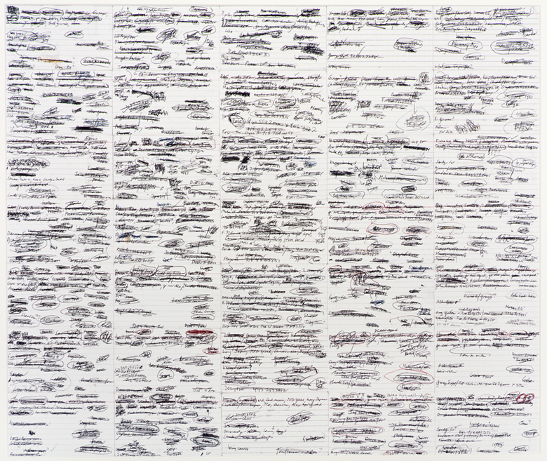 35 Days, from 2003, is a photographic print of a drawing comprised of thirty-five index cards. Each card appears to be a random blast of names, phone numbers, and references. It is unclear if there is a hierarchy or order to how the information is written onto each card. The discord of each card is amplified and echoed by the larger composition. Instead of creating a linear narrative, the grid creates a rhythm, one that honors the mundane. Unable to focus on the individual written items, we are unclear on the specific details of John Waters’s day. Instead we get an understanding of how he works.