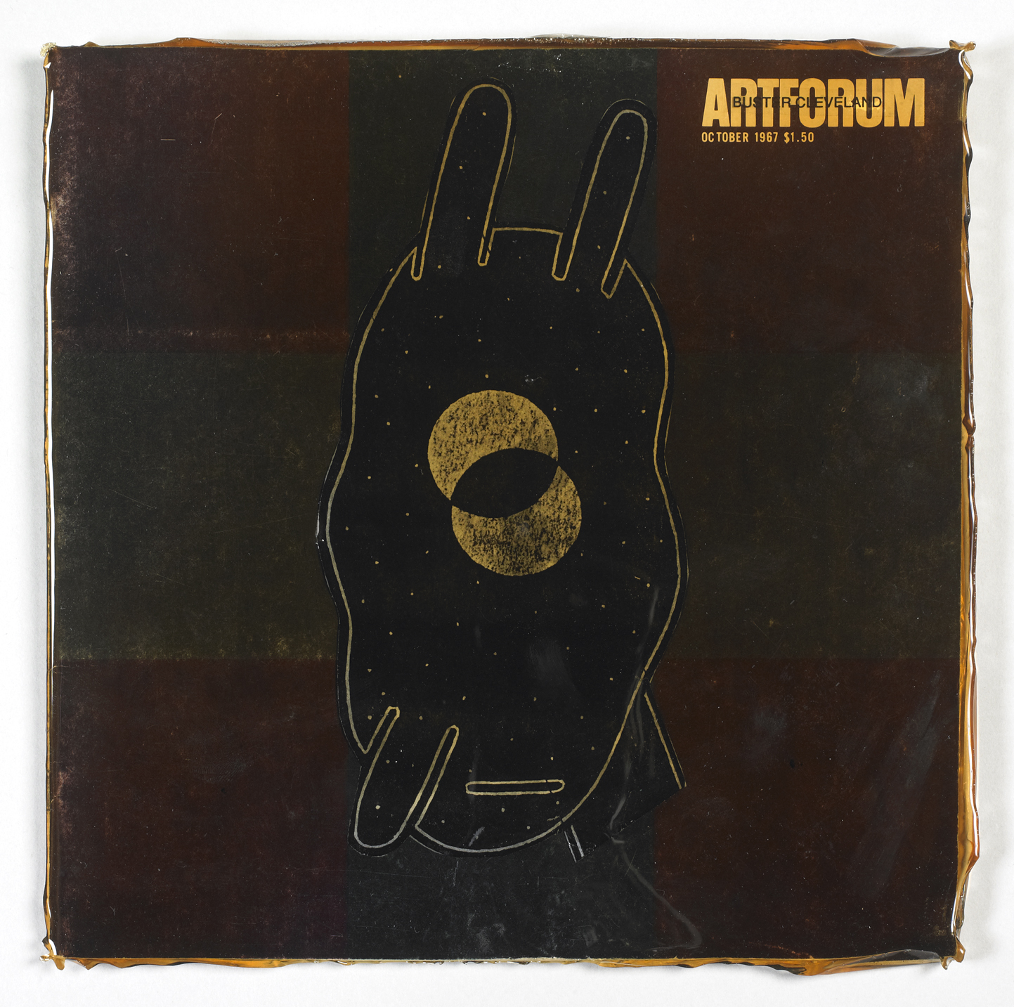 In many ways, the resin-coated Artforum covers can be viewed as maquettes for the ART FOR UM foam core works—they are simpler versions of the mailed pieces. Yet Cleveland seemed to regard the resin magazines as art works in their own right. They were presented in exhibitions, and there are many resin magazines that do not have a counterpart in a foam core version that was eventually mailed. The October 1967 Artforum cover, made in 1993 and included here in the Art=Text=Art exhibition, falls under this category—it is a stand-alone object that was never turned into an ART FOR UM piece. Titled Ray Johnson, the work pays tribute to the renowned mail artist, one of Cleveland’s major influences. The original Artforum cover features a painting by Ad Reinhardt, with whom Johnson served as an assistant in the 1950s. Cleveland then collaged a one-eyed figure on top of the image, perhaps alluding to Johnson’s own art, and printed “Buster Cleveland” on top of the Artforum logo before coating the entire work in resin, entombing this monument to his mentor.