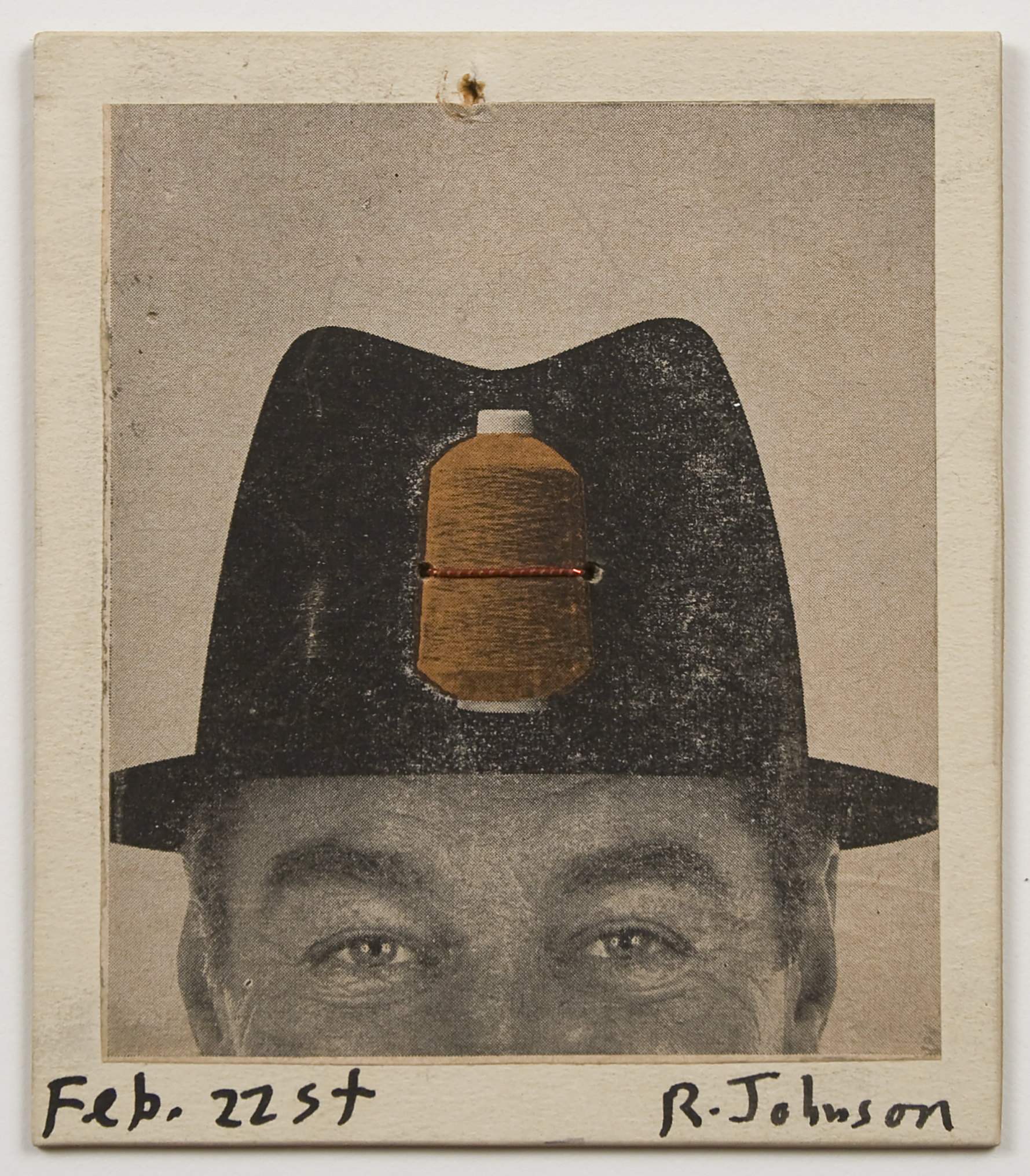 Best known for his work in collage and correspondence art, Ray Johnson remains an enigmatic figure in the post-war American landscape. His use of time- and community-based media—such as objects sent through the US Postal Service—added a dimension to his work that differentiated him from his cohort. Correspondence art resonated primarily with the practices of a slightly older generation of artists, including John Cage, whose work followed principles of conversation rather than communication, the former implying egalitarian involvement and the latter more closely associated with dictation. Ever curious about meaning, Johnson often turned to puns and homonyms as a way of introducing multiple simultaneous meanings into a picture. In Untitled (Man In Hat) from 1960, Johnson uses a found image of a man wearing a hat, onto which is superimposed a spool of thread. Though the spool looks like a collage element, it is in fact native to the printed image; Johnson has added only the thread, which appears to be wound around the spool in the picture. This is a classically Johnsonian conceit: a visual play between what is appropriated and what is inserted, and also a linguistic rhyme (head/thread).