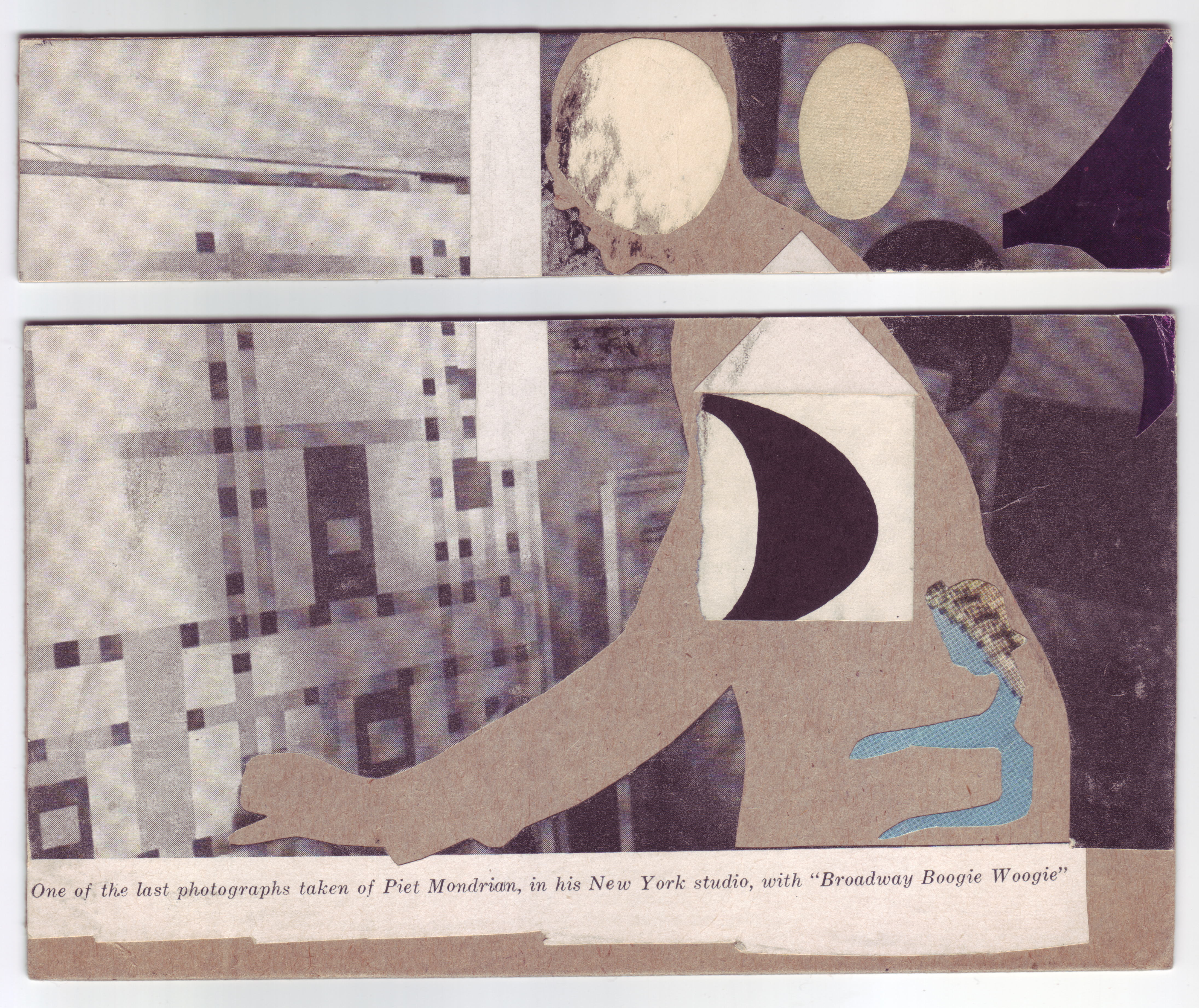 Ingres, one of the early forebears of Modernism, is renowned for his renderings of complex spatial relationships, which served as examples for later generations of artists, including Piet Mondrian, whose work Johnson repeatedly referenced. Indeed, the other collage on view here features a photograph of Mondrian in front of Broadway Boogie Woogie, arguably his most famous late painting. Johnson has cut Mondrian’s body out of the picture, leaving only the artist’s outline to suggest his presence. By making Mondrian conspicuously absent and by partially covering Ingres’s face, Johnson puts particular pressure not just on the relationship of artist to artwork, but also on the authorial presence and visibility of the artist within a finished work of art. If we can understand the inclusion of Ingres as Johnson’s protest against dismissal of artworks on the basis of form without consideration of conceptual depth, the physical absence of Mondrian can in turn be understood as Johnson’s investigation of the presence of the artist – or lack thereof – and its effect on the terms of reception for a particular work or idea.