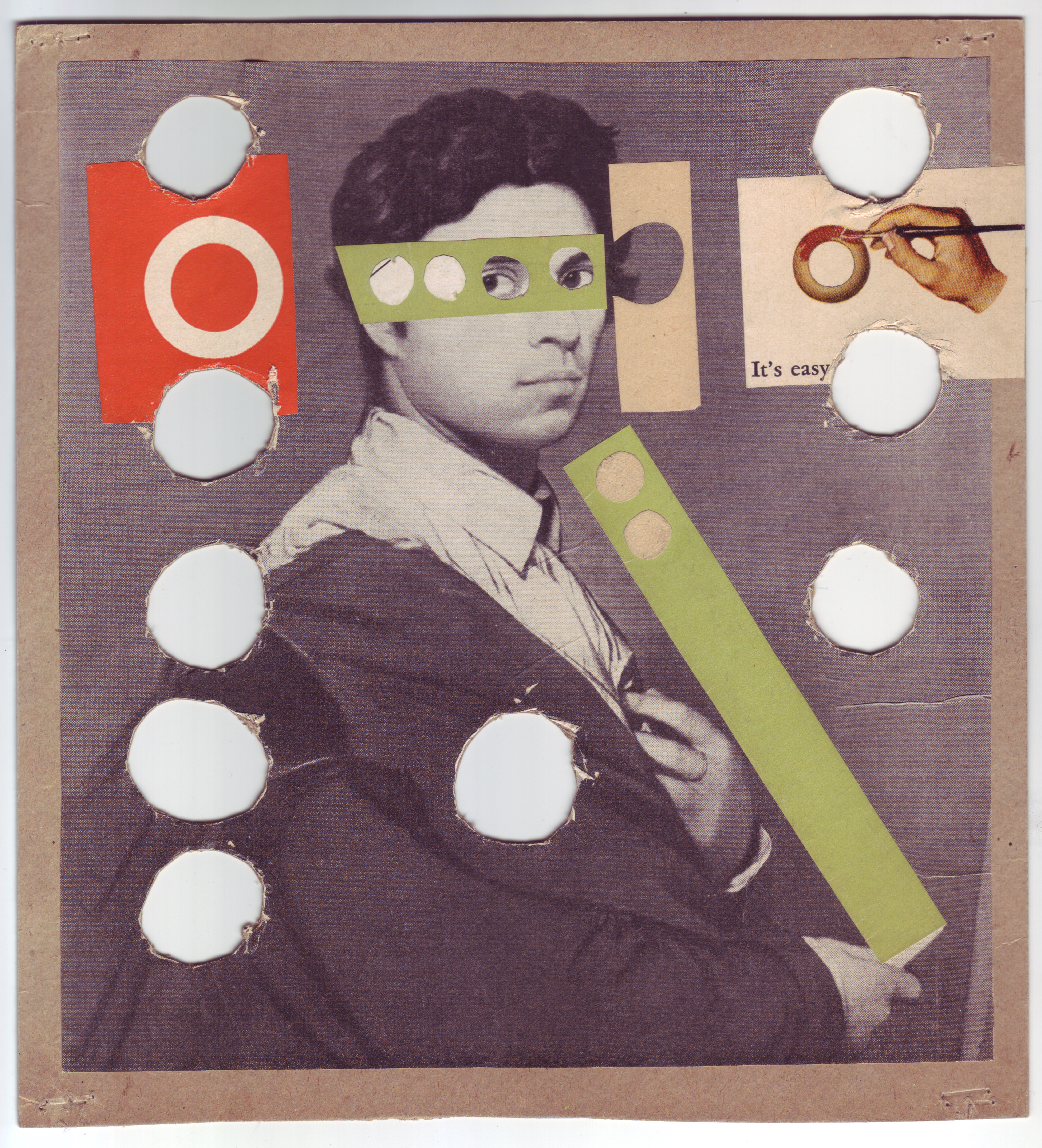 Two later collages in the Poetry Collection of the University Libraries, University at Buffalo, suggest Johnson’s exploratory engagement with the historical evolution of meaning in fine art. Both pieces, undated but likely made in the 1970s, use images cut from art catalogues of the time. One of these collages features a reproduction of an 1804 self-portrait by French Neoclassical painter Jean-August-Dominique Ingres, excised from a magazine and mounted on cardboard. Circular holes have been cut out of the picture and cardboard, echoed by similar holes cut into the strips of paper collaged over various parts of the composition. A collage element affixed toward the right edge, also cut from a magazine, bears a picture of a hand painting a circular shape red, with the words, It’s easy, printed below.
