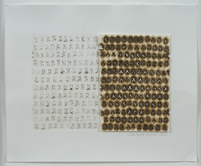 Nehmad’s interest in creating a visual vocabulary for pain has also influenced her choice of printmaking and drawing processes. In the painstakingly placed X markings of Untitled, the viewer can observe Nehmad’s expert use of pyrography, the application of a heated object to create burnt marks, and collagraphy, in which a substrate of various textural materials is used to print either in intaglio or relief. These two processes combined create an even stronger relationship between the paper and the body of the viewer. The imprint of the burning technique evokes a searing sensation, as if the heated object is being applied to one’s skin rather than to the surface of the paper. This technique is particularly evocative in Untitled, in which the symbol Nehmad chooses to repeat is an X. The letter X brings certain images and ideas to mind, many of which seem applicable to Nehmad’s attempts to visually represent physical pain. For example, the phrase “X marks the spot” feels pertinent here, as the continual scoring of the letter X could be seen as an attempt to give pain a location, both on the body and on the paper. Additionally, an X can symbolize danger or inaccuracy–something to steer clear of or something wrong. In using this particular character, Nehmad demonstrates both the desire to locate her pain and the deep emotional toll of the body’s betrayal of the mind.