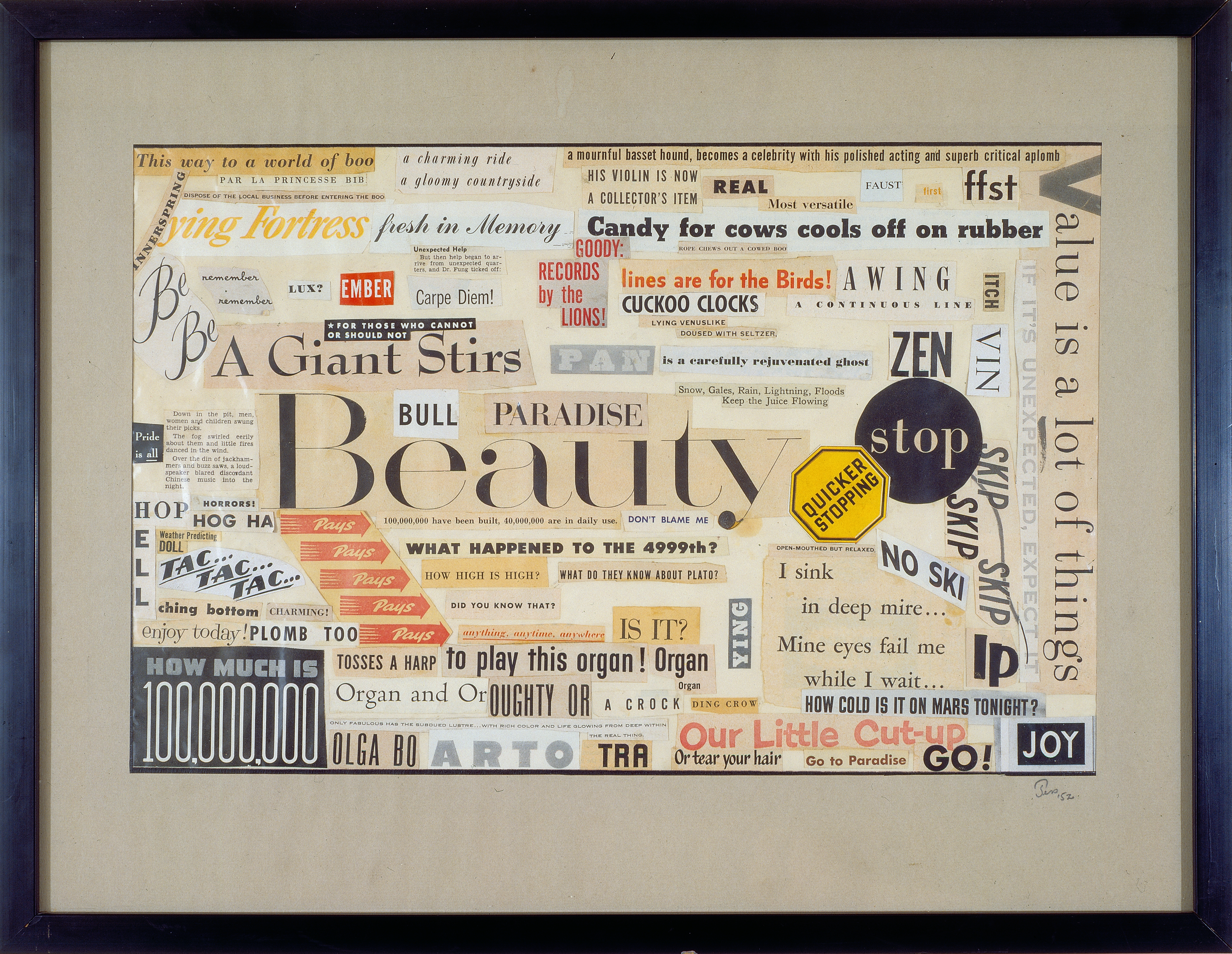 Jess is best known for his intricate collages, which incorporate themes of mysticism, chemistry, seduction, and aesthetics. Open-Mouthed but Relaxed (1952) is one of the artist’s earliest collaged works. The evocative word Beauty dominates the frame. Central to Jess’s project was the subjective role of the viewer in drawing associations between words and images, allowing the work to speak multiply at a social-historical moment when categories were typically understood as fixed. Clichéd phrases such as if it’s unexpected, expect it are pulled from advertising and pasted alongside works of poetry and the words real, Zen, stop, and go. The provocative title has a sexual undertone but could easily have been taken from a work of literature or poetry; media such as these formed the majority of Jess’s source material.