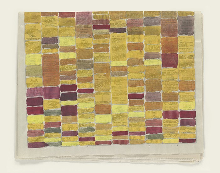 The third watercolor by Dean in this exhibition further demonstrates his interest in human connection, in shared experience within unique experience. Untitled (Help Wanted Half Page) takes the employment classifieds section of the newspaper as its departure. While the blank squares of the crossword puzzle drawings retain some of their anonymous potential, the text that remains visible in the help wanted work speaks more directly of the human stories that draw Dean to newspapers. These stories are both obscured and highlighted by Dean’s fields of colors, which differentiate each ad, each square, hinting at encoded connections between seemingly distant parts—at the possible overlap between the carpenter, the pharmacist, and the picture framer.