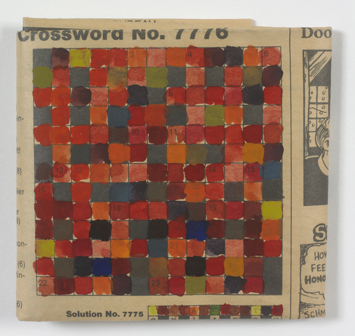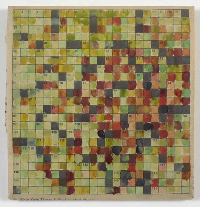 I always had a strange relationship with crossword puzzles because I never found an answer to any of the questions that are asked in the puzzles, so I was always looking at crossword puzzles as a blank grid. And they were staring at me, staring back as an unresolvable puzzle. That’s why I started to fill in the squares where letters are supposed to be, these letters constituting words, and replacing them by color and painting the whole grid over with brushstrokes instead of alphabet. By painting watercolor on the crossword puzzles, it’s like changing the rules. The crossword puzzle struck me as an interesting space for its geometric qualities and at the same time for its familiarity. Crossword puzzles, once they are painted, remain recognizable. And they become quite ambiguous. What are we looking at? Are we looking at a crossword puzzle? Are we looking at a small abstract painting? I was also interested in the fact that they are very small. For the most part, I was painting them quite quickly. And so in that very simple gesture, there was the possibility to make something ambiguous and complex, which is: cognitively, what are we looking at? And the way that these puzzles are painted is that we have color on the foreground. It’s not color that’s used to construct a space. We really have two realities, and one is in the foreground: it’s color. The familiar reality of the crossword puzzle is in the background. And that is fundamental to the way I work, even with my videos. The predominance of color as a language and as a filter is something that, since these earlier works on paper and some complex video productions, is very fundamental to the way I think about painting and the way I apply color. And in this situation, this particular situation, color functions as a code, another language, one that has its own repetition and rhythms. We don’t fully understand it but we do relate to it. And then I started realizing how many differences there were between different designs, so to speak, the way that the crossword puzzles were written and how, graphically, there were different types of numbers and different thickness of lines, and how the whole newspaper around it could leak some information. So I started collecting crossword puzzles from newspapers in languages that I didn’t know: Chinese, and Arabic, and so on, Russian, because the alphabets and the printing were so different and interesting. And I would go to this newsstand near my studio in Brooklyn and buy all these newspapers. And the person who sold them, after a while, looked at me and said, “Well, how many languages do you speak?” Well, I had to say that I would only paint the crossword puzzle.