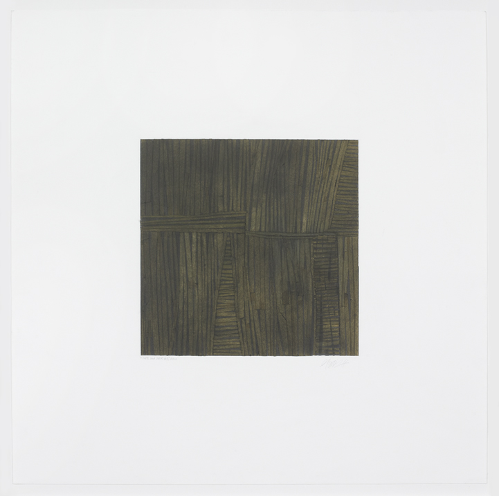 Interestingly, an answer can perhaps be found by considering Over and Over #5 as a text, a concept that in fact reconciles the seemingly disparate references of thatch-work and language. Returning to the original Latin, the word “text” originally derived from the past participle of texere, meaning to weave or to fabricate.1 Placing emphasis on the act of making, such linguistic roots suggest that the process and structure of Over and Over #5 is essential to reading the work as a form of text. Yet although the methods responsible for the creation of Ortiz-Hernández’s drawings are known, the precise point at which the artist initiated, continued, or finished the piece cannot be determined due to the accumulation of the tape strips. With each piece of tape placed over and over onto the page without any established beginning or end, Over and Over #5 must therefore be approached as a non-narrative text. Indeed, viewers of the drawing must be converted into readers in order to notice how the delicate fold of a strip of tape refuses to lay flat; how shadows and contours are formed by soft tonal highlights; how wisps of charcoal powder escape from the boundaries of the square. The materials’ subtleties are only revealed when Over and Over #5 is closely read, examined, analyzed, over and over.